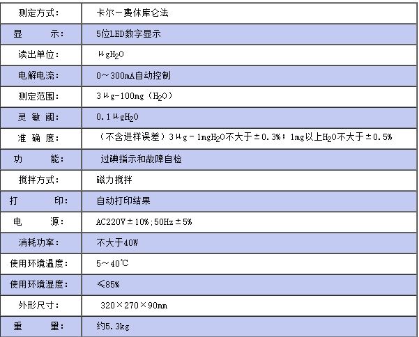 儀器符合GB/T7600;SH/T0246;GB/T606及采用卡爾—費休法測定樣品中水分的有關(guān)標(biāo)準(zhǔn),儀器采用了先進(jìn)的自動控制電路,電解電流自動跟蹤控制,外型結(jié)構(gòu)新穎,從而使該儀器工作更可靠,使用更方便,具有分析速度快(一分鐘出結(jié)果)、操作簡便、精度高、自動性強等特點,同時具有自動打印功能,可將實驗結(jié)果、做樣時間、樣品編號自動打印出來,廣泛應(yīng)用于石油、化工、電力、鐵路、環(huán)保等部門。
