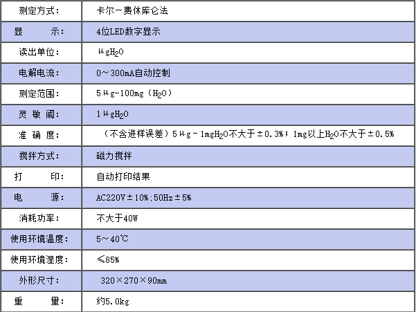 儀器符合GB/T7600;SH/T0246;GB/T606及采用卡爾—費休法測定樣品中水分的有關(guān)標(biāo)準(zhǔn)。儀器采用了先進的自動控制電路,電解電流自動跟蹤控制,外型結(jié)構(gòu)新穎,從而使該儀器工作更可靠, 使用更方便,具有分析速度快(一分鐘出結(jié)果)、操作簡便、精度高、自動性強等特點, 同時具有自動打印功能,可將實驗結(jié)果、做樣時間、樣品編號自動打印出來, 廣泛應(yīng)用于石油、化工、電力、鐵路、環(huán)保等部門。